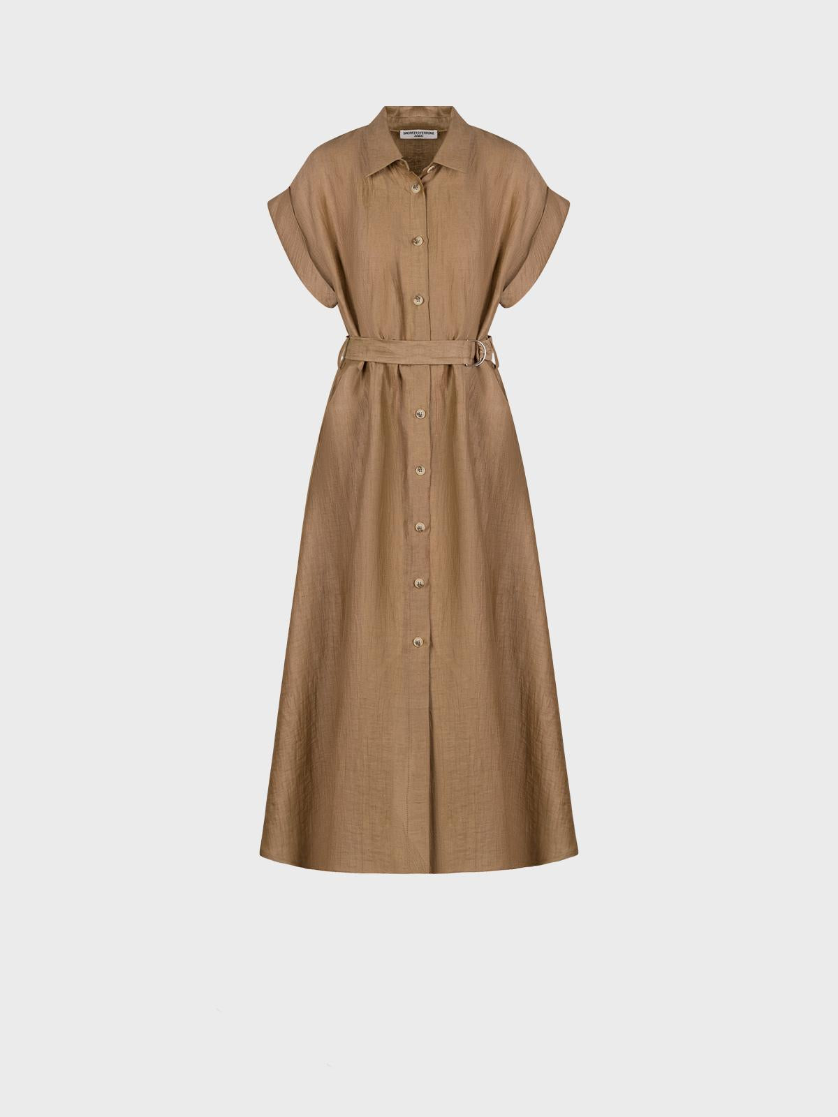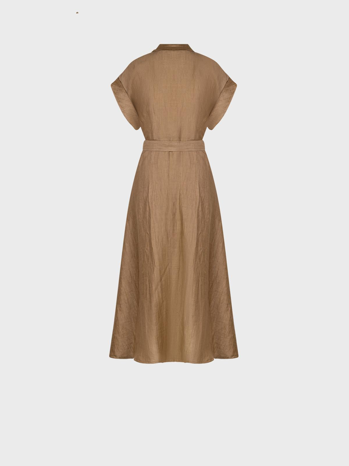 Abito lungo chemisier in misto lino, mezza manica, con cinta e risvolto su manica