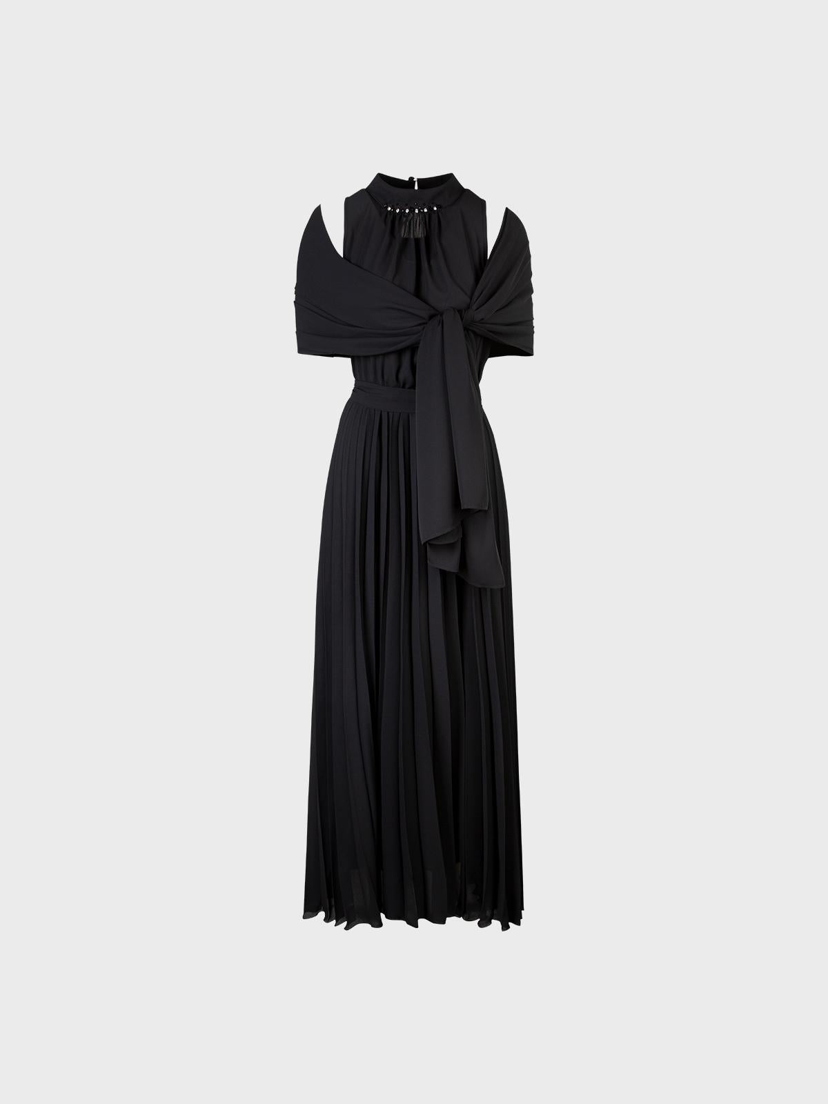 Abito in georgette con gonna plisse ricamo sul collo cinta e stola.