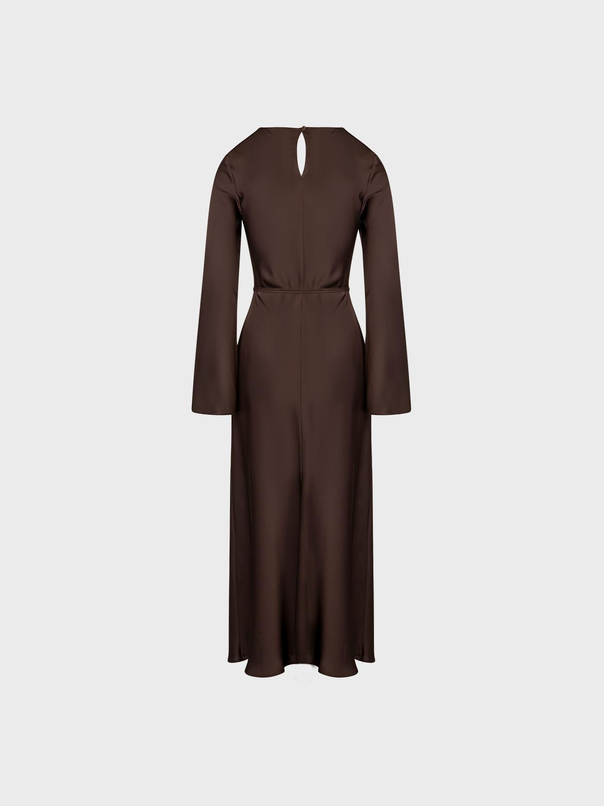 Abito in doppio satin tagliato in sbieco con scollo barca,maniche lunghe e cinturino da annodare