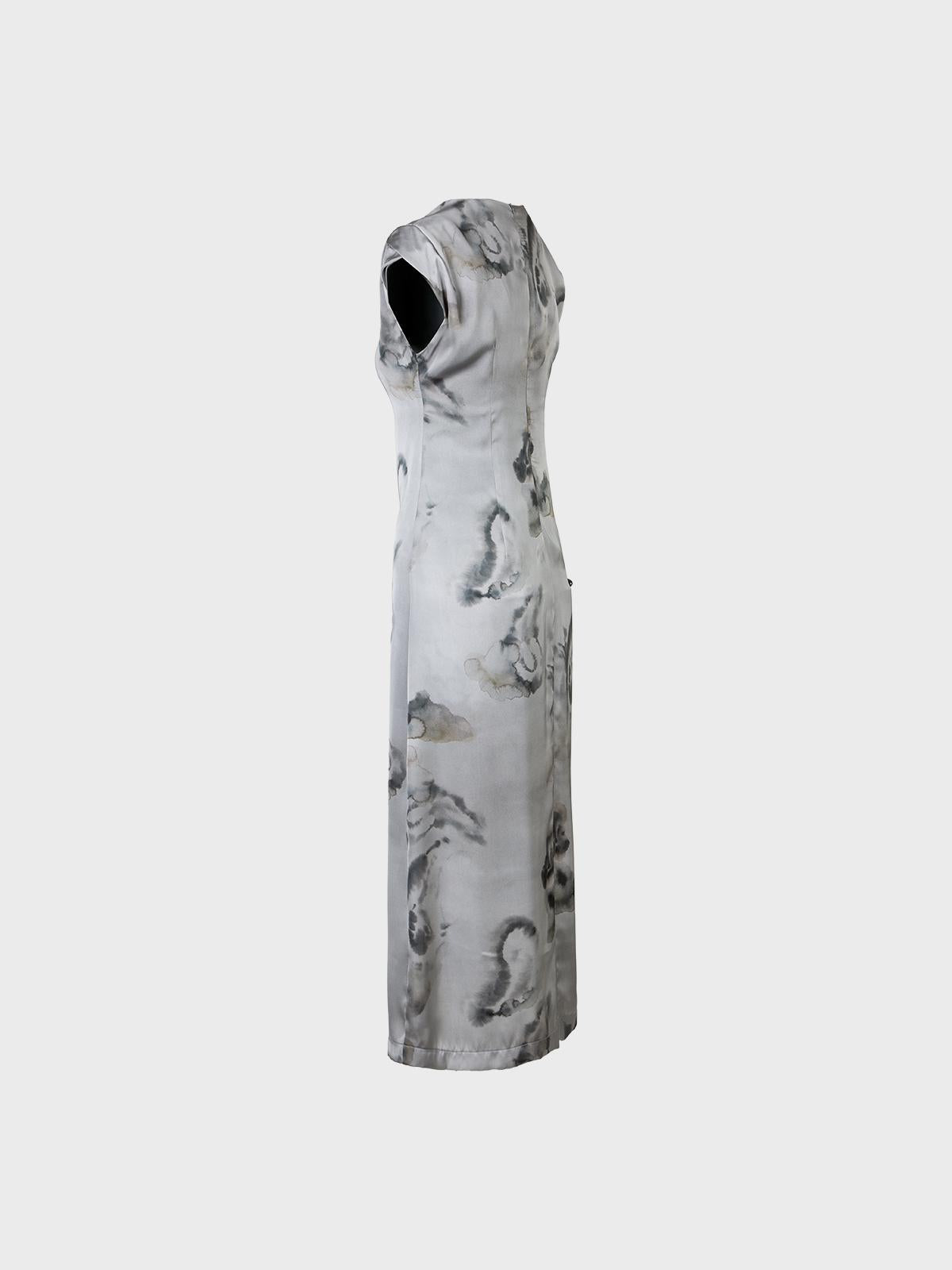 Abito longuette Doppio poly raso stampato Scollo tondoSpalla scesa Spacco davanti