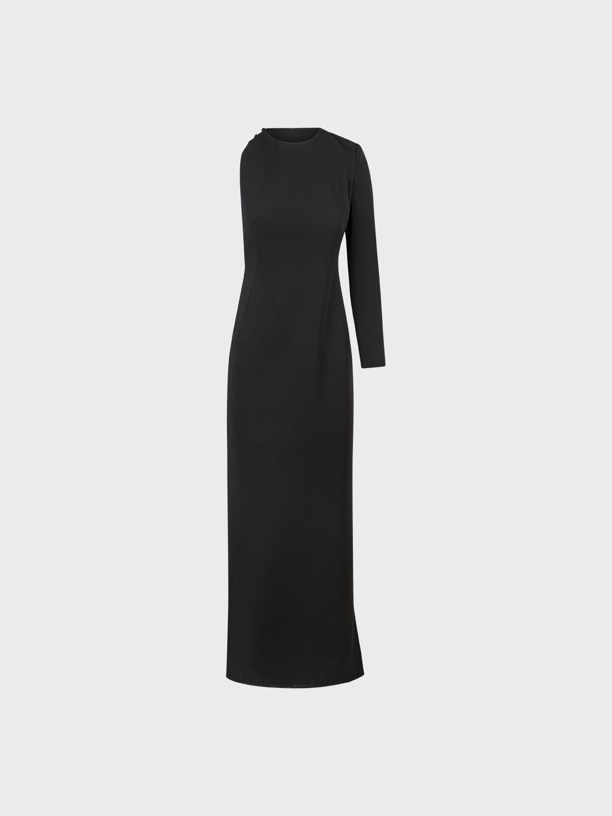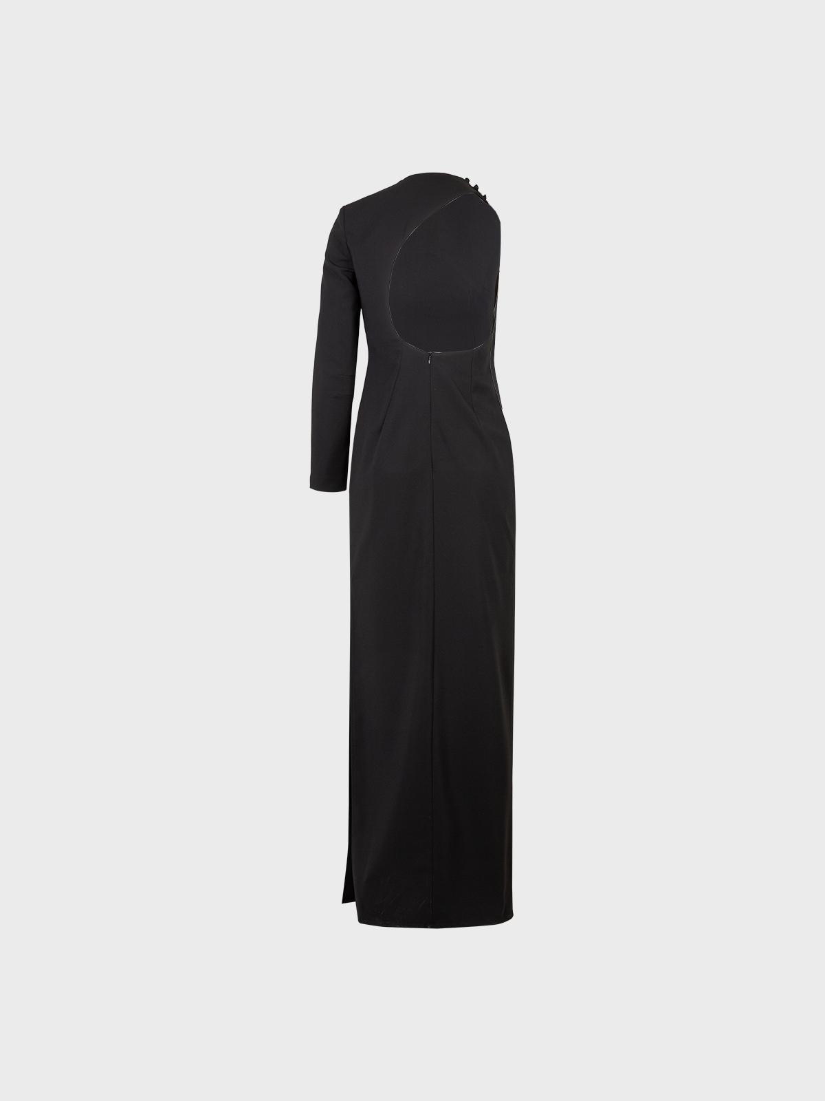 Abito lungo monospalla in crepe fluido con schiena nuda,spacco laterale e bottoni ricoperti sulla spalla