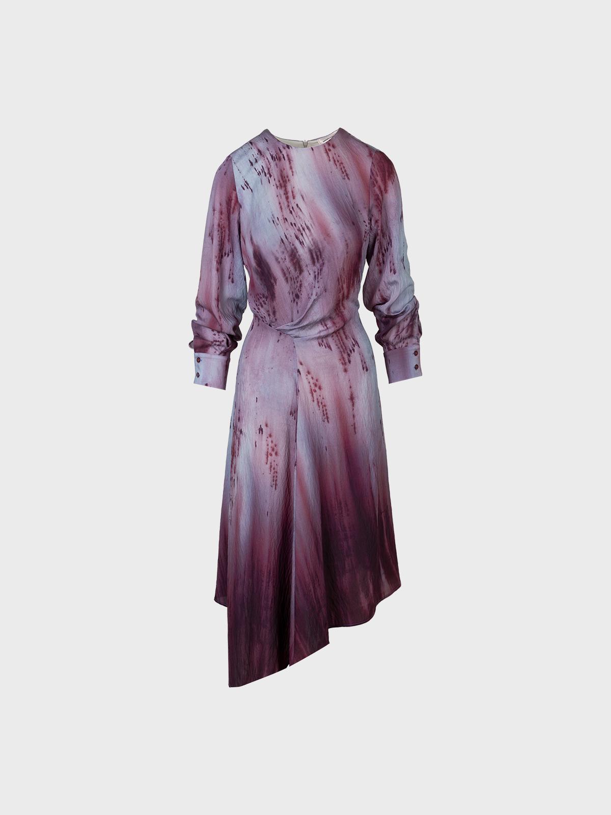 Abito midi in viscosa stampata con scollo tondo, maniche lunghe e riprese laterali