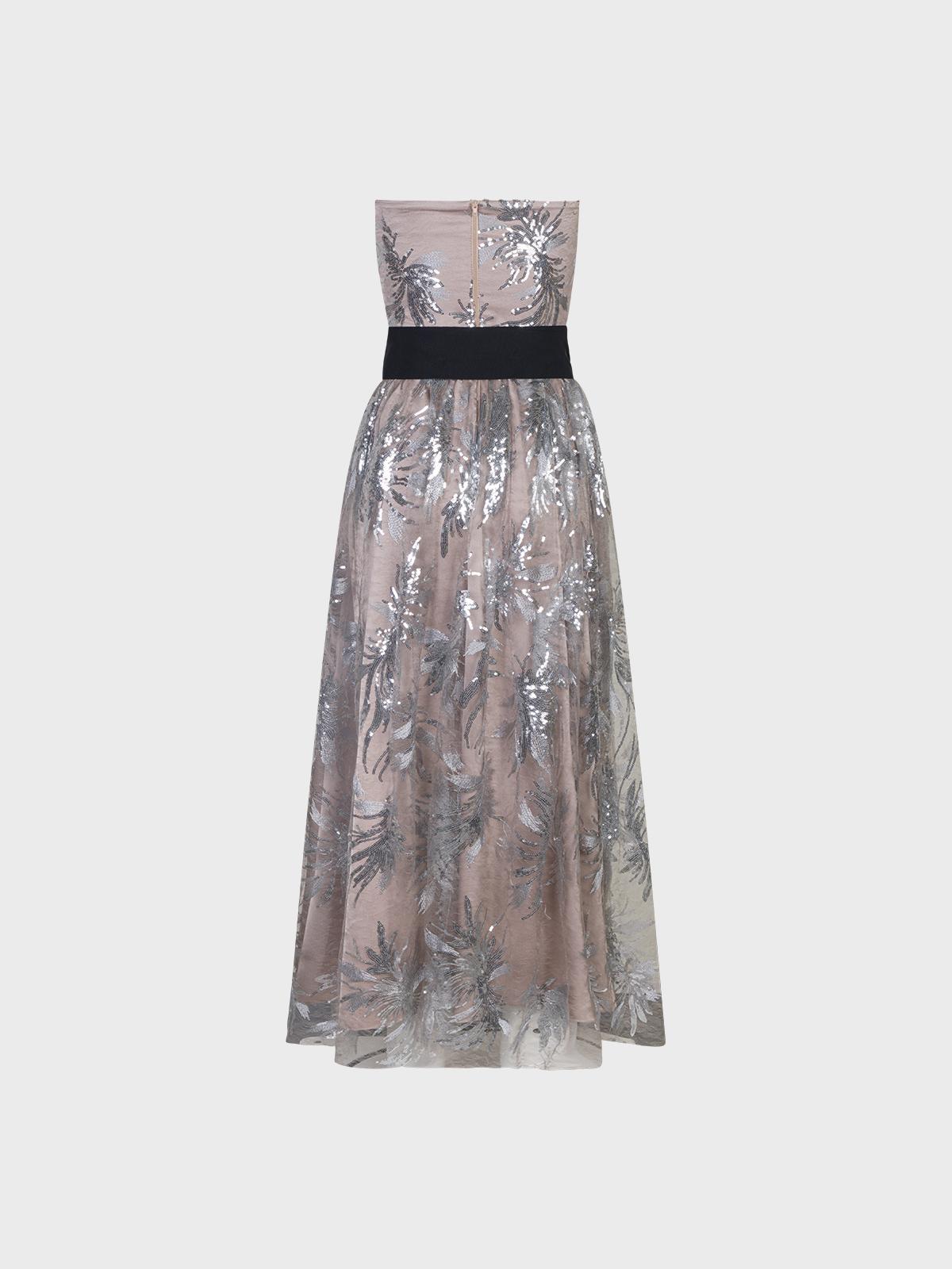 Abito ricamato con paillettes su pizzo di nylon con corpino decollete e gonna arricciatta