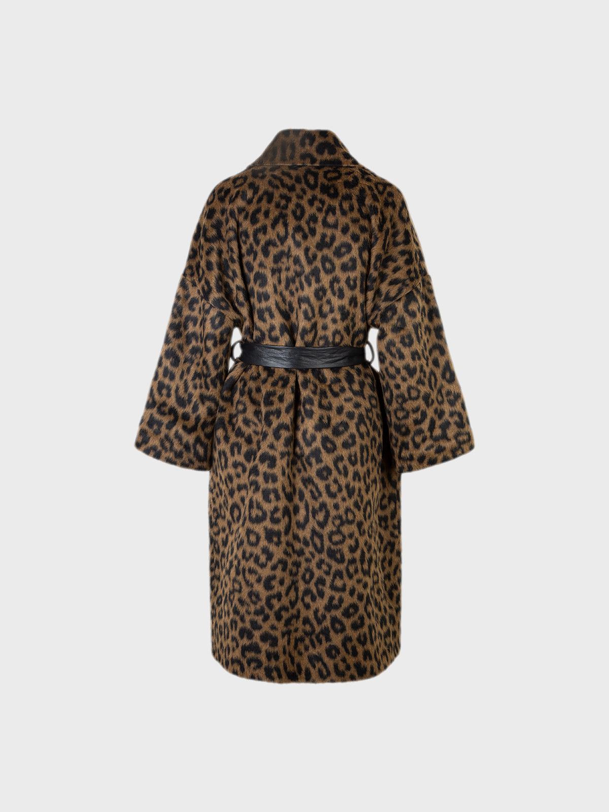 Cappotto di linea over senza bottoni con cintura in eco pelle, tessuto misto lana con disegno animalier.