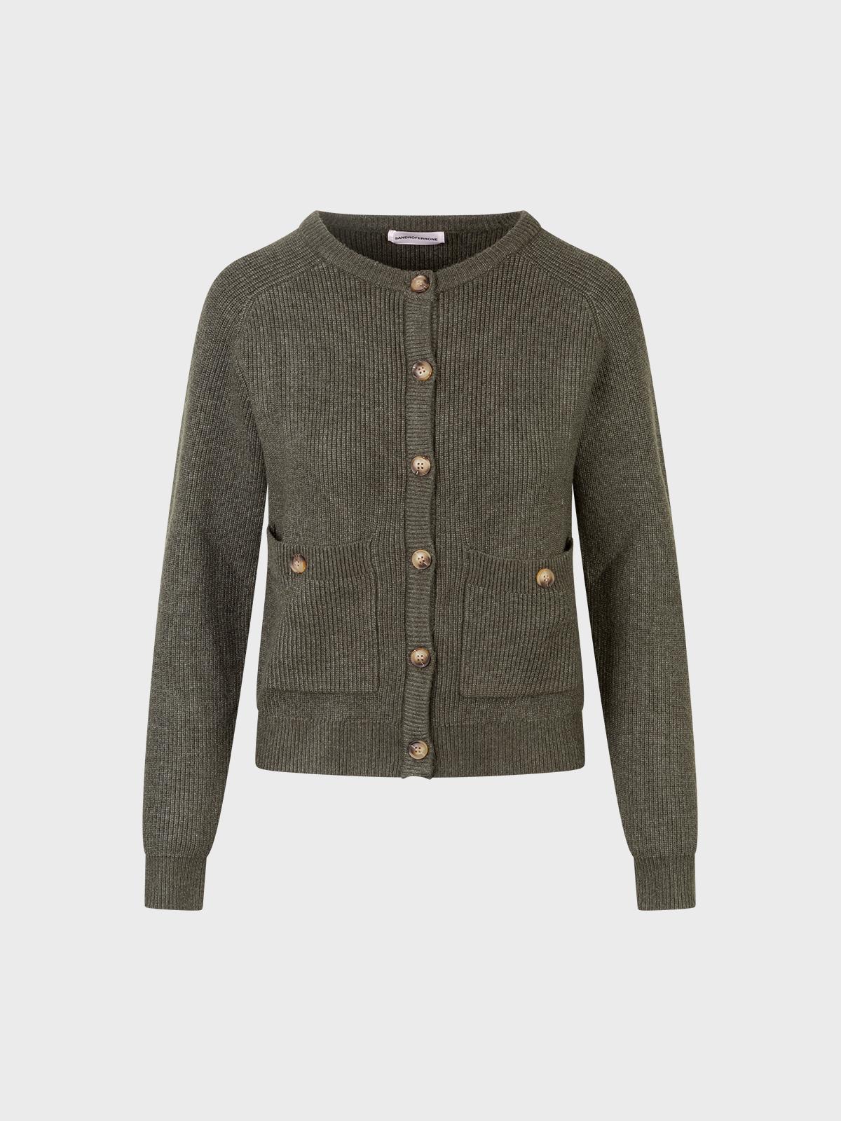 Cardigan in maglia smacchinata a coste con scollo tondo,giro maniche a martello e tasche applicate