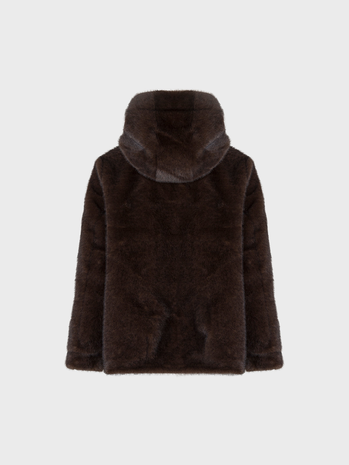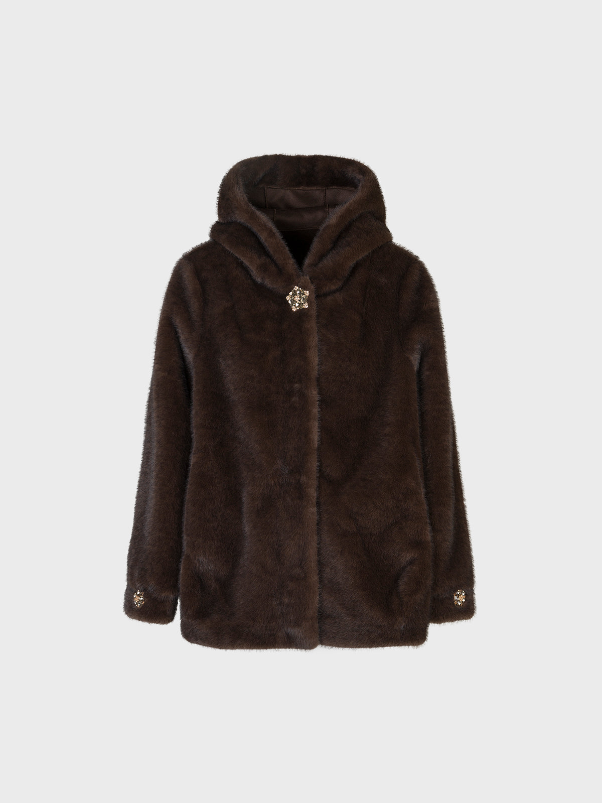 Blouson in eco visone con cappuccio e bottoni in gioiello