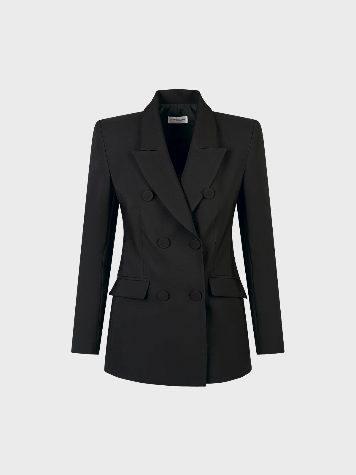 Giacca doppio petto in tessuto tecnico bielastico con revers a lancia e tasche a filo con pattina