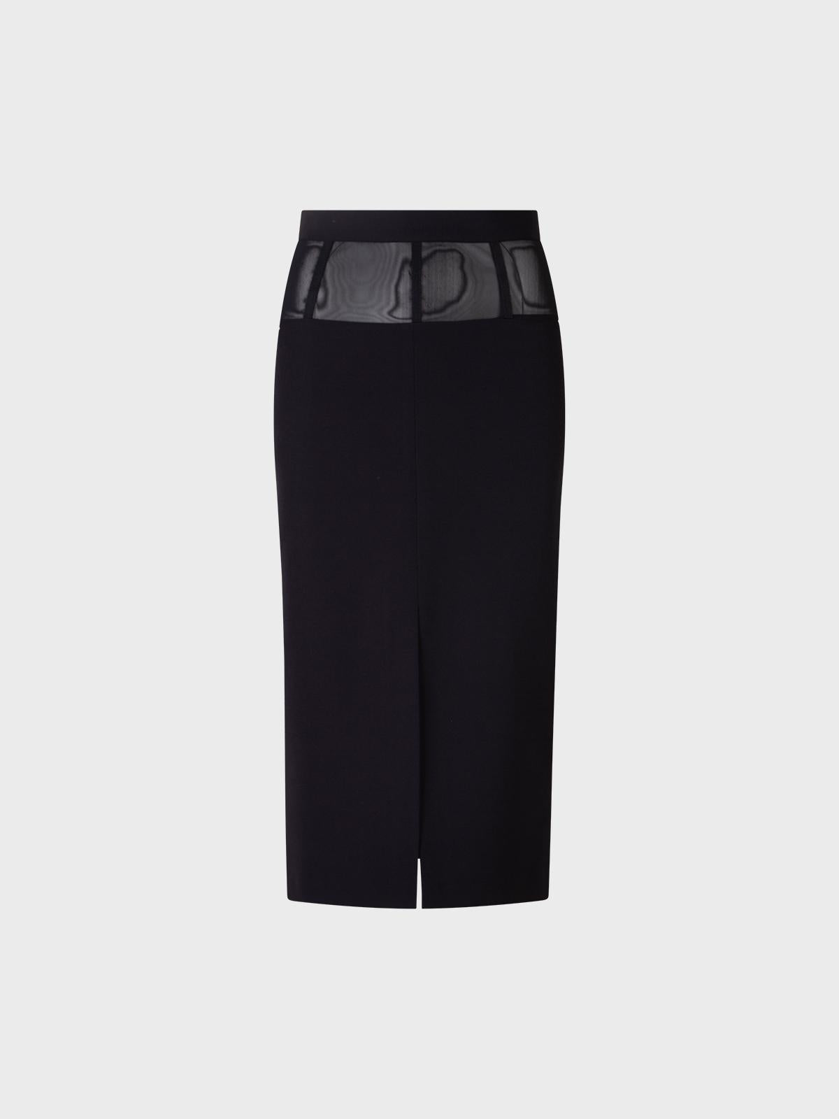 Gonna a tubino combinata in tecnico comfort e baschina in guaina con gros grain,spacco davanti e zip dietro