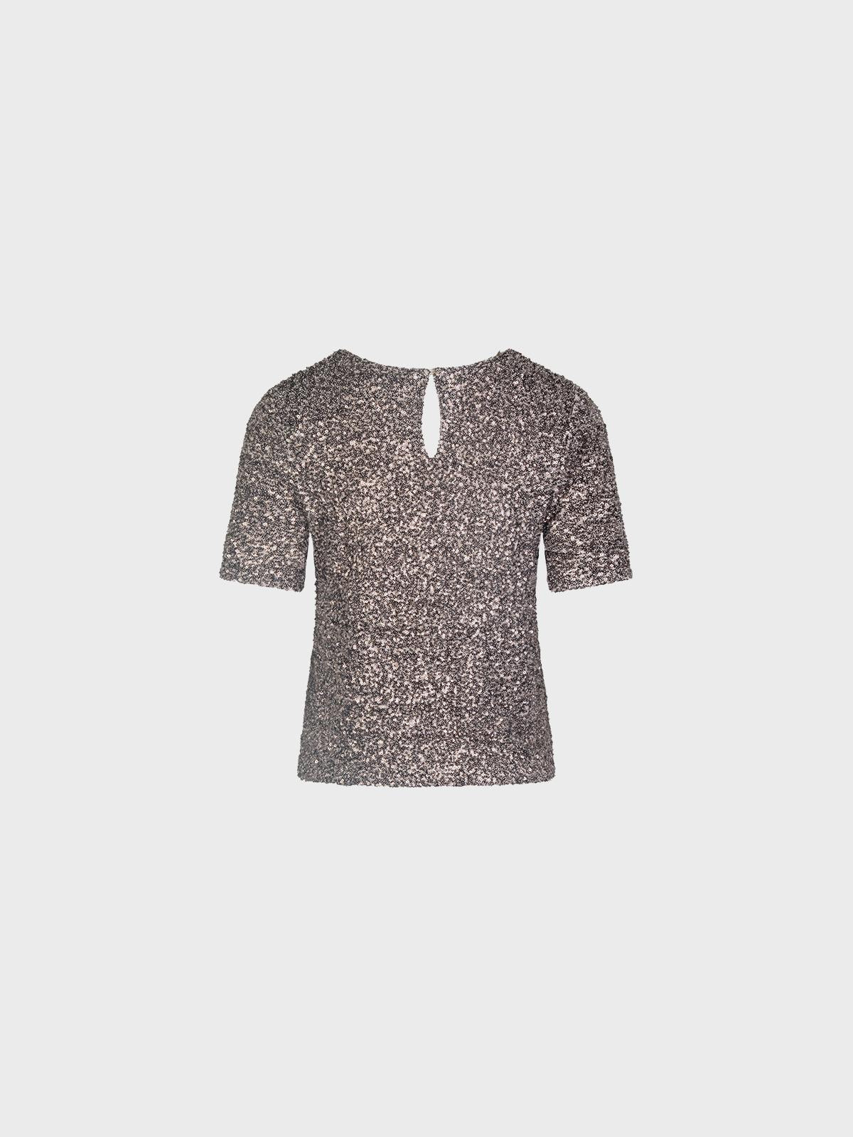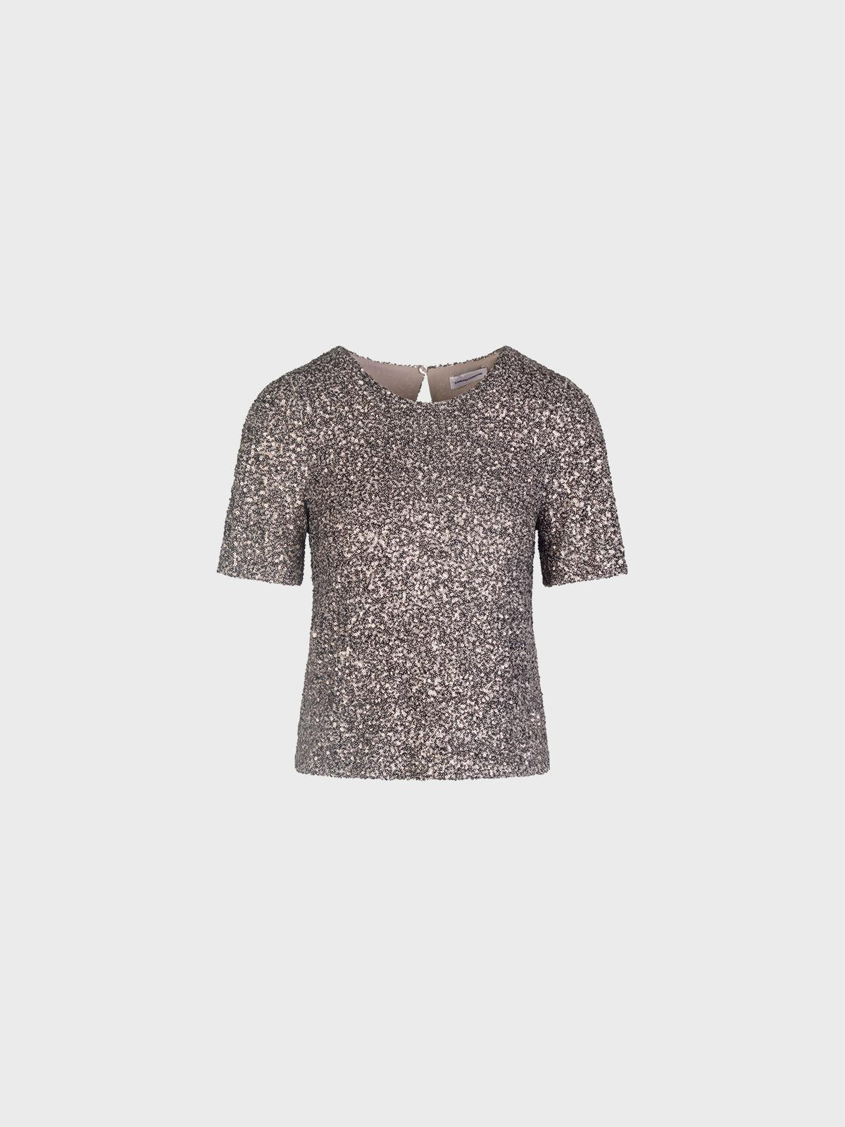 Maglia in tulle elasticizzatoRicamato con micro paillettesScollo tondoManiche corte