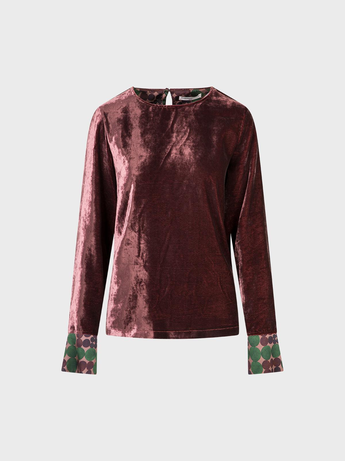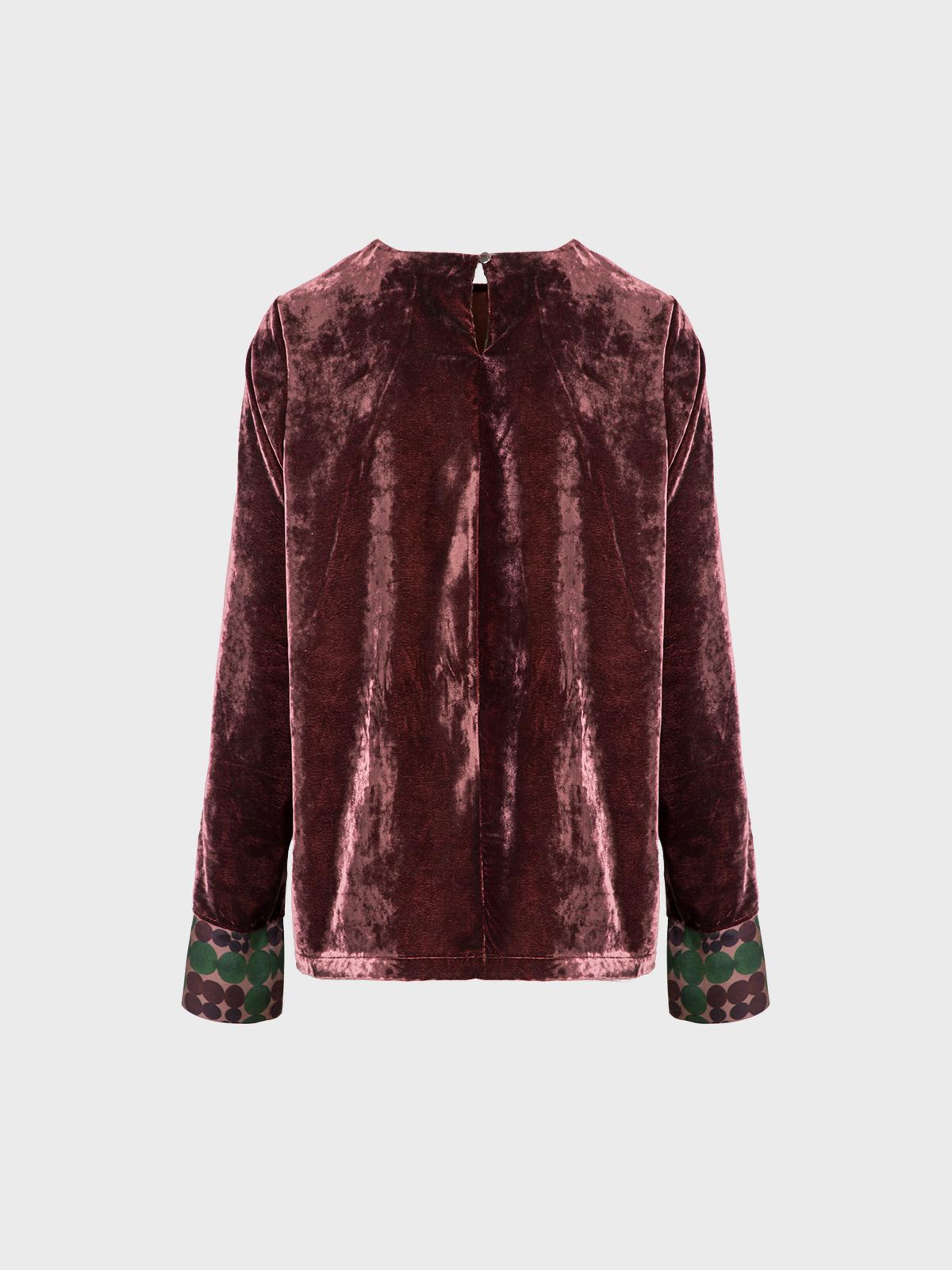 Maglia in velluto manica lunga con inserimenti di stampa in raso di viscosa per i polsi e l'interno del collo