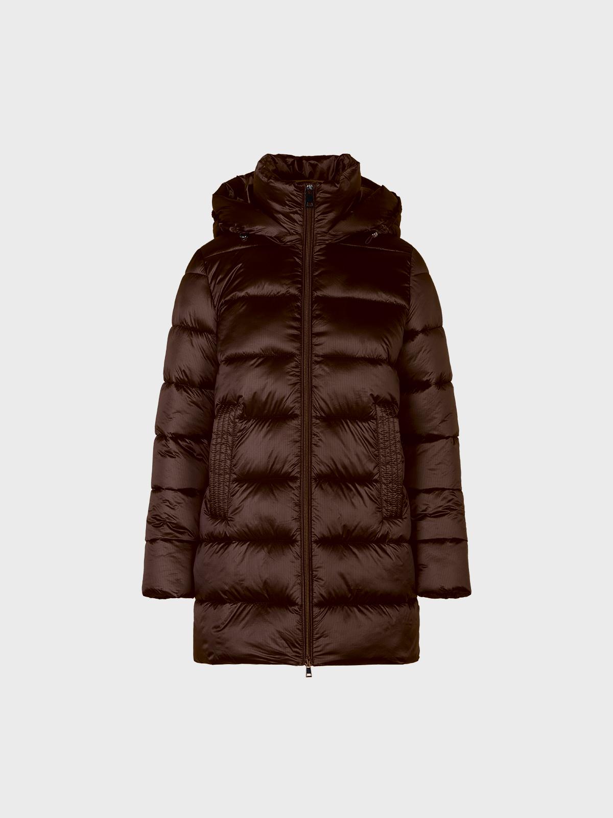 Piumino lungo con zip centrale,tasche a filetto e cappuccio con coulisse staccabile