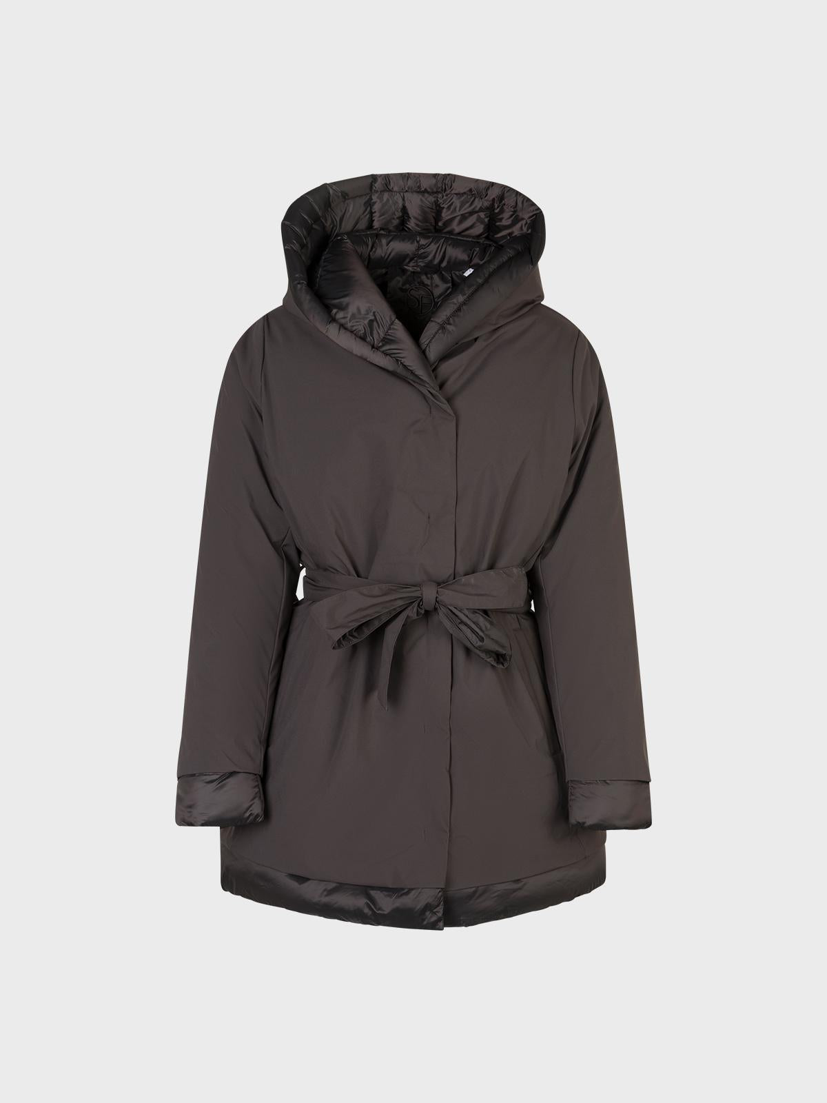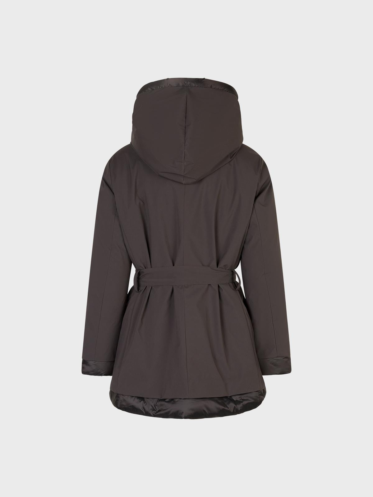 Piumino bimateriale con cappuccio e cintabordo in contrasto su manica e fondo